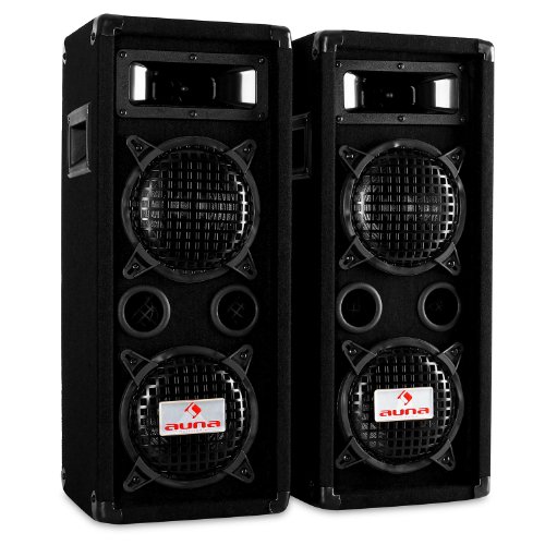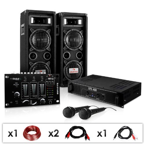 DJ-24M Karaoke-Komplett-Set tolle Party-Musikanlage mit DJ-Mixer, 1200 Watt PA Boxen + Verstärker inkl. Kabel-Set & 2 Mikrofone ( für bis zu 150 Personen, USB – & Stereo-Cinch Eingang, 4x 16cm Subwoofer)